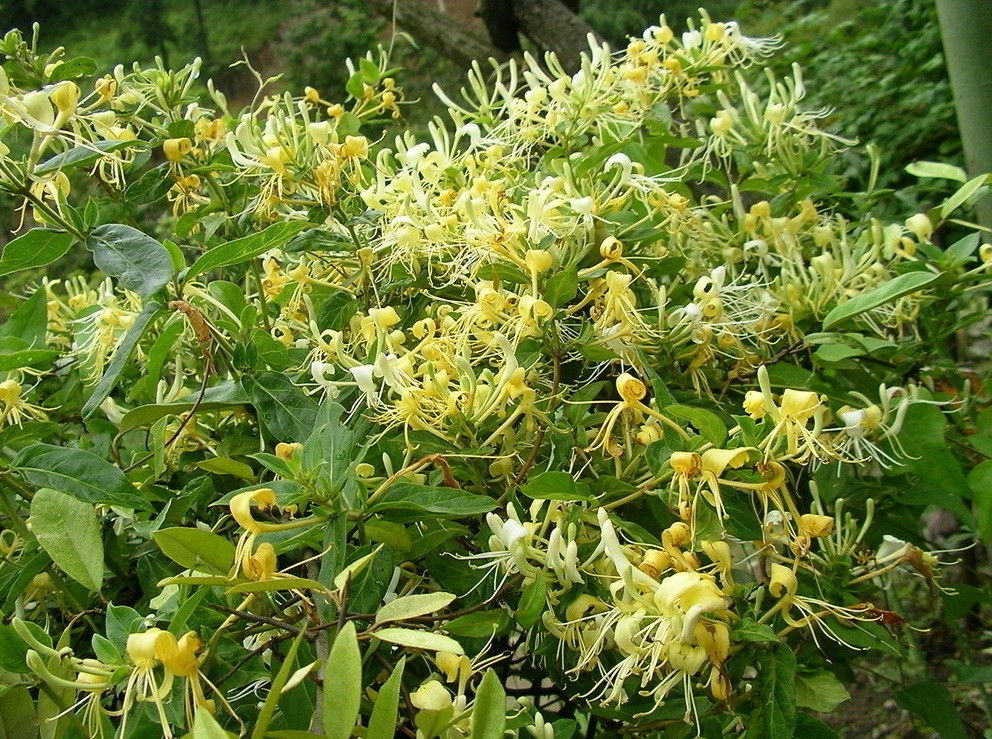 金银花属多年生半常绿缠绕及匍匐茎的灌木。小枝细长,中空,藤为褐色至赤褐色。卵形叶子对生,枝叶均密生柔毛和腺毛。夏季开花,苞片叶状,唇形花有淡香,外面有柔毛和腺毛,雄蕊和花柱均伸出花冠,花成对生于叶腋,花色初为白色,渐变为黄色,黄白相映,球形浆果,熟时黑色。