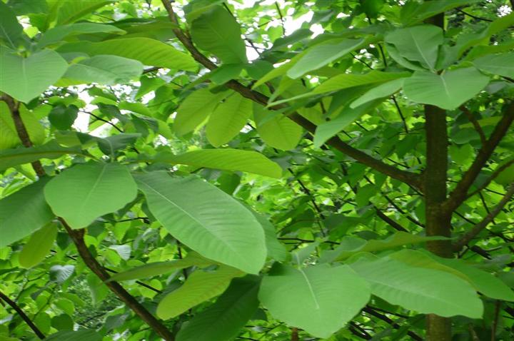 落叶乔木,高达20米;树皮厚,褐色,不开裂;小枝粗壮,淡黄色或灰黄色,幼时有绢毛;顶芽大,狭卵状圆锥形,无毛。叶大,近革质,7-9片聚生于枝端, 长圆状倒卵形,长22-45厘米,宽10-24厘米,先端具短急尖或圆钝,基部楔形,全缘而微波状,上面绿色,无毛,下面灰绿色,被灰色柔毛,有白粉;叶 柄粗壮,长2.5-4厘米,托叶痕长为叶柄的2/3。